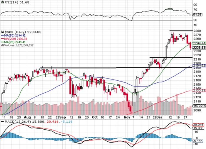 Index S&P 500 se sestupem o 1,1 % vrátil ke svému 20dennímu klouzavému průměru, respektive mírně pod něj. Denní graf ale oproti předchozímu týdnu větší změny nezaznamenal. Nejbližší supporty jsou 2 220 a 2 190 (to je linie, pod kterou by mohl přijít razantnější propad). Na opačné straně je rezistence na historických maximech okolo 2 280 a další na psychologické hladině 2 300.