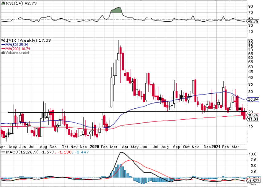Index volatility VIX (takzvaný index strachu, který měří rozkolísanost trhu) klesl již citelněji pod 20 a je na úrovni ze začátku roku 2020. Pro akcie vysílá optimistický signál.