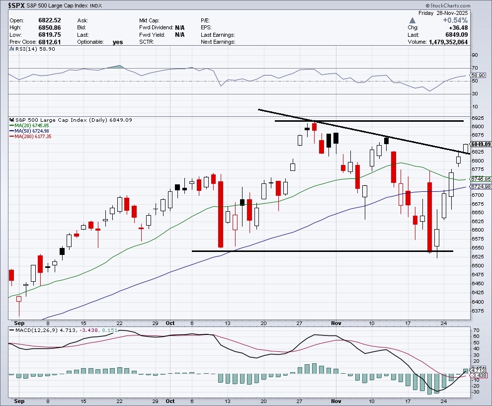 Index S&P 500 díky vzestupu v závěru páteční zkrácené obchodní seance v listopadu přidal 0,13 %. Jde o sedmý měsíční vzestup v řadě, i když samozřejmě s odstupem nejméně výrazný. Blíží se konec roku, historicky pro akcie silné období (pozor, listopad také "měl být" silný, ale nebyl). Od začátku roku je index S&P 500 16,45 % v plusu, což by za celý rok byl nadprůměrně pozitivní výsledek.