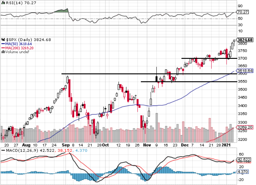 Týdenní i denní grafy indexu S&P 500 jsou v býčím nastavení. Nejbližší support je na 3 700, tedy na zavírací ceně ze 4. ledna. Významným a důležitým supportem je zóna 3 550 až 3 600. V případě sestupu indexu pod ni by se výhled změnil na negativní. Na druhé straně rezistence teprve čeká na své určení.