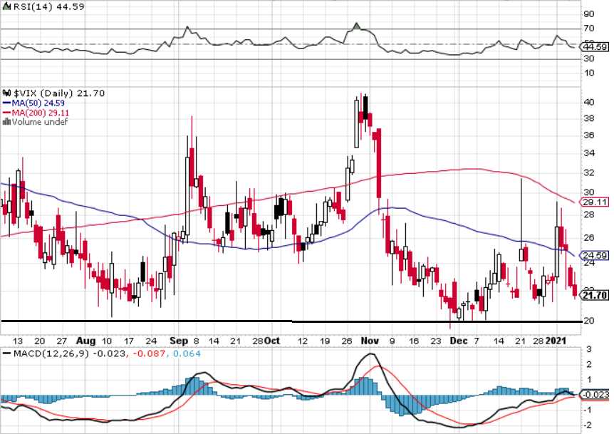 Index volatiliy VIX (takzvaný index strachu, který měří rozkolísanost trhu) v pondělí vystřelil o 25 % výše těsně pod 30 bodů, v pátek ale opět zavíral jen lehce nad 20. To je i silná úroveň podpory (tedy inverzně rezistence pro další býčí vývoj na akciovém trhu).