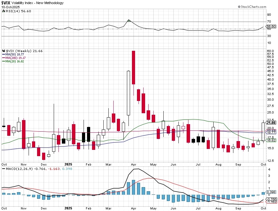 Index volatility VIX (takzvaný index strachu, který měří rozkolísanost trhu) v pátek vystřelil intradenně nad 22 bodů a za celý týden stoupl o 30,1 %. Je vysoko nad 21 body a nad klouzavými průměry. Pro akcie už přestal být na pozitivní úrovni, nákupní signál v minulosti vysílal na ještě výrazně vyšších hladinách.