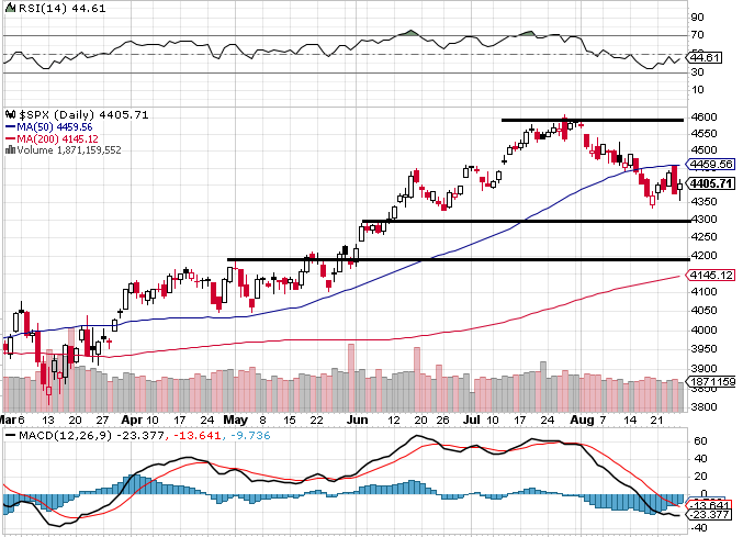Index S&P 500 je mezi 50- a 200denním klouzavým průměrem a jeho graf je v neutrálním nastavení. Poklesy se zatím vždy zastavily nad 4 300. Zejména na týdenním grafu se o žádný velký pokles zatím nejedná.