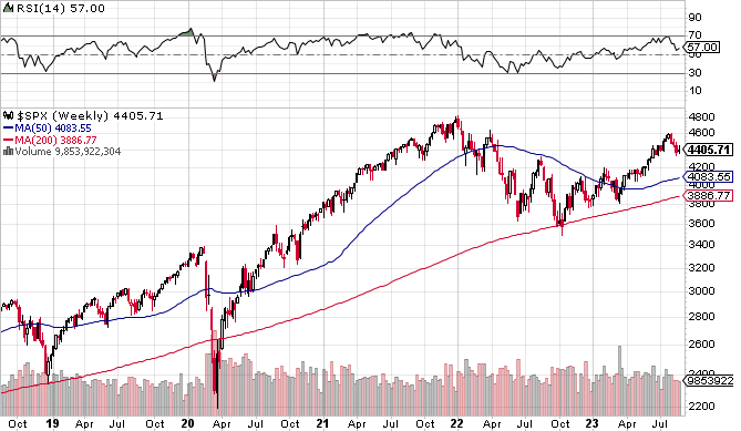 Vývoj akciového indexu S&P 500 (týdenní graf – W1):