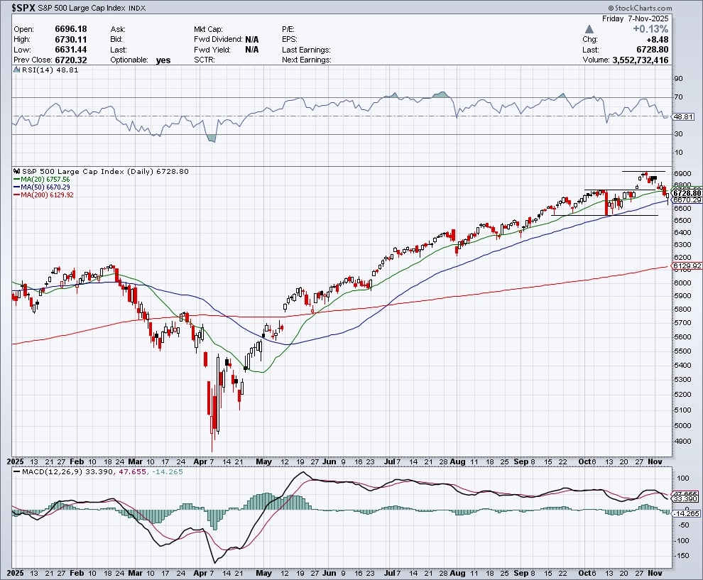 Po nějaké době trh nezaznamenal nové historické maximum. Index S&P 500 uzavřel kurzové odskoky z konce října a zkorigoval předchozí poměrně zběsilý růst. Otestoval a prolomil support na 6 750 a v druhé polovině týdne uzavíral pod ním. V pátek při výrazném intradenním obratu trh naopak obhájil hladinu 50denního klouzavého průměru.