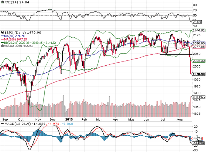 Za celý týden index S&P 500 odepsal 5,77 %, což byl nejvyšší týdenní pokles indexu od září 2011. Akcie z mnohaměsíčního úzkého rozpětí vykolejily negativní zprávy z Číny, benchmark bez zaváhání prolomil jeho spodní linii okolo 2 040 bodů a pátečním propadem o 3,19 % průraz potvrdil.