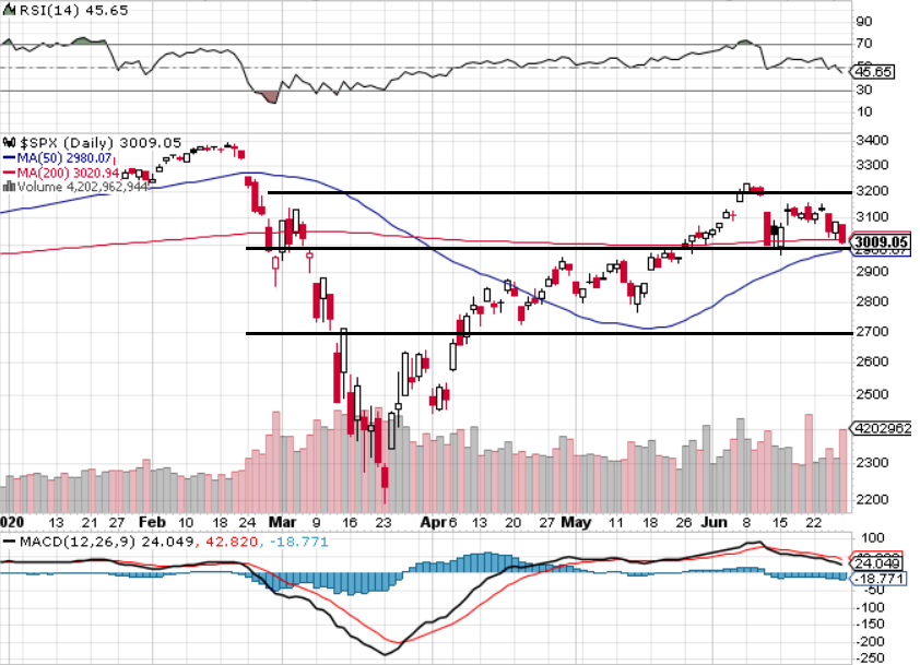 Index S&P 500 středečním a pátečním propadem naznačil, že atakování historických maxim není na pořadu dne. Pravděpodobnější je nyní testování supportu na 3 000. Po propadu indexu o více než 5 % 11. června se benchmark pod 3 000 dostal jen intradenně o dva dny později.