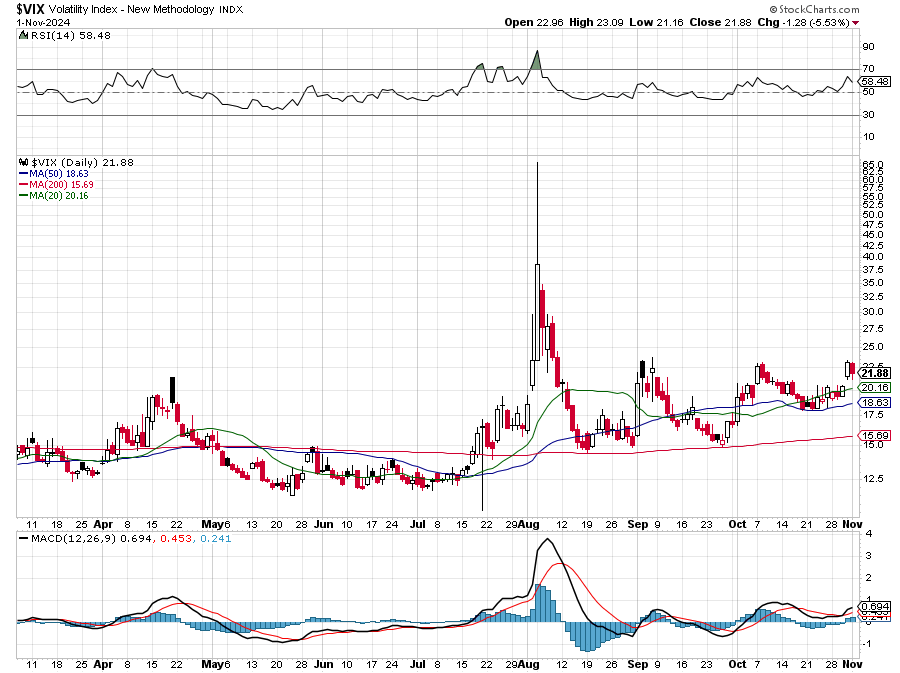 Index volatility VIX (takzvaný index strachu, který měří rozkolísanost trhu) je nad 20 body a v druhé polovině týdne se vyhoupl na úrovně maxim ze začátku září a také z října. Je nad 50- i 200denním klouzavým průměrem a pro akciový trh nevysílá optimistický signál.