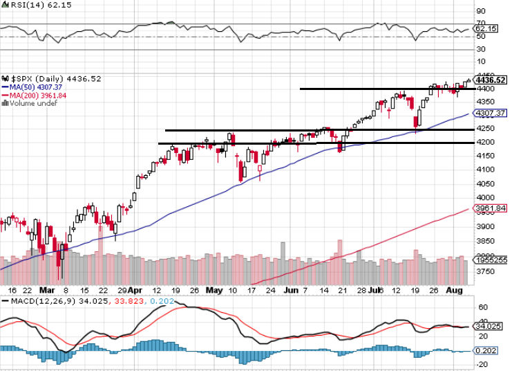 Růst o bezmála procento na denním grafu indexu S&P 500 prakticky nic nezměnil. Kurz se drží okolo 4 400 a poslední dva týdny je ve velice úzkém rozpětí. Nejbližší support se rýsuje právě na kulaté hladině 4 400, důležitá podpora je pak v pásmu 4 250 až 4 200. Pokud by je index při případném sestupu prolomil, pokles by pravděpodobně pokračoval a nastavení grafu by se změnilo.