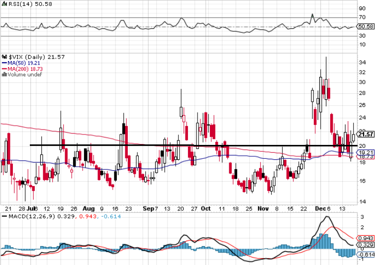 Index volatility VIX (takzvaný index strachu, který měří rozkolísanost trhu) je nad 20 a nad klouzavými průměry. Vzhledem k výraznějším poklesům akciového indexu ale nebyl nárůst volatility až tak dramatický.