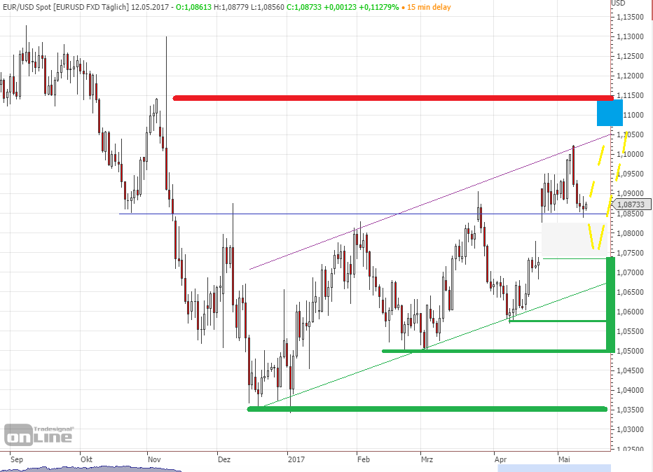 Měnový pár EUR/USD (eurodolar) po francouzských prezidentských volbách vystoupal až nad 1,1000. Poté korigoval a lákal obchodníky ke vstupu do short obchodů na uzavření dubnového víkendového GAPu. Tři dny konsolidace kolem 1,0850 potvrdily, že měnový pár prostě nechce dolů a při první dobré zprávě (před chvílí slabší americká data – maloobchodní tržby a spotřebitelská inflace) eurodolar skokově posílil nad 1,0910.