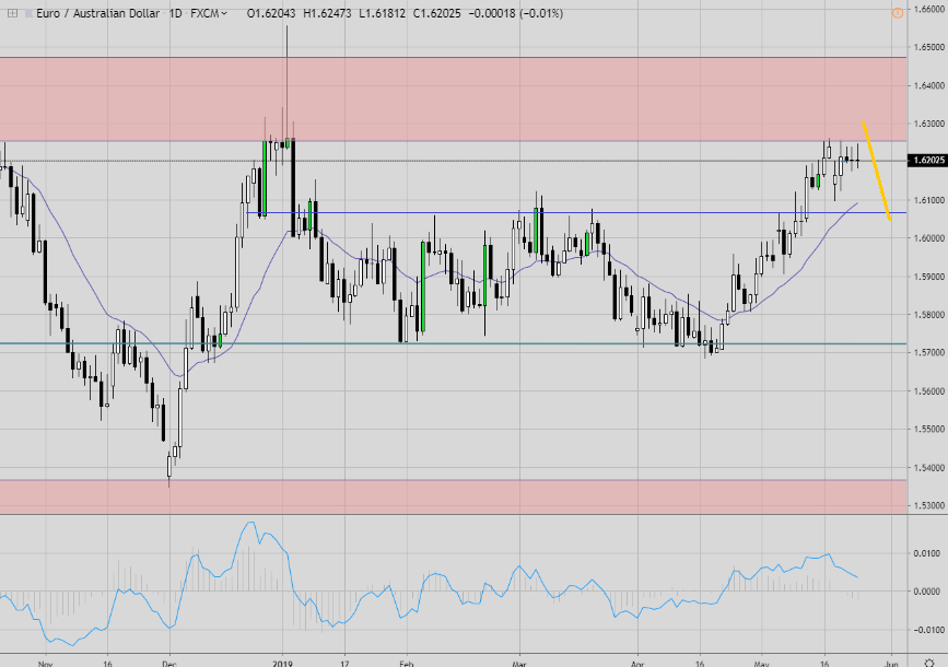 Cena ropy (WTI) se zastavila ve významné konfluenční support oblasti 57-58 USD (dolní hranice korekčního kanálu + breaklevel support oblast). Fundamentálně se během včerejška na komoditě vůbec nic nezměnilo, proti medvědím fundamentům (obchodní válka USA x Čína, vyšší americké týdenní zásoby) působí mnohem významnější býčí faktory, které aktuálně ale cena zatím neřeší (OPEC+ zřejmě prodlouží omezení produkce, rostoucí napětí kolem Iránu a jeho významně snížená produkce, boje v Libyi, nepokoje v Alžíru a Venezuele, plánované odstávky velkých rafinérií kvůli údržbě, nefunkční ropovod Družba, začátek motoristické sezóny,…).