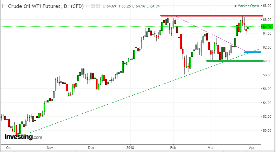Ropa WTI nám od minulého pátku zkorigovala o 2 USD, očekávám však ještě větší korekci v dalších dnech nebo týdnech. Short pozice budu uzavírat na 63 a 62 USD. Poté se opět začnu poohlížet po signálech k nákupu, optimálně v pásmu 58 - 62 USD pro první pozice. Střednědobý ropný trend je stále nahoru a důvodů pro pokles není více než důvodů pro růst.