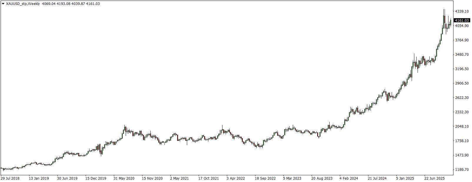 Spotová cena zlata vzrostla od 3. října 2023 z minima 1813,90 USD za unci do letošního 20. října o 142 procent na rekordních 4381,21 USD/oz. Ve středu uzavřela na 4163,51 USD.