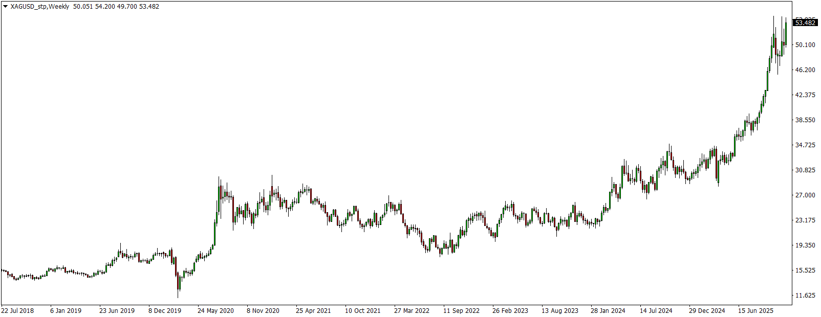Od minima 20,67 USD za troyskou unci (oz; 31,1 gramu) z 3. října 2023 vzrostla do letošního 13. listopadu o 163 procent na rekordních 54,38 USD/oz. Od té doby zhruba šest procent ztratila a tento týden ve středu uzavřela na 51,33 USD za unci.