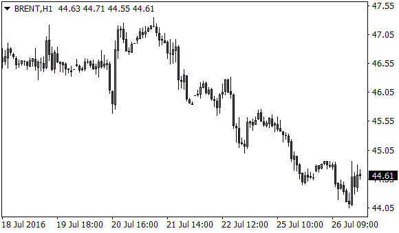 Vývoj ceny ropy Brent (1hodinový graf – H1):