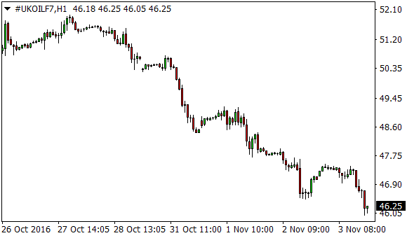 Vývoj ceny ropy Brent (1hodinový graf – H1):