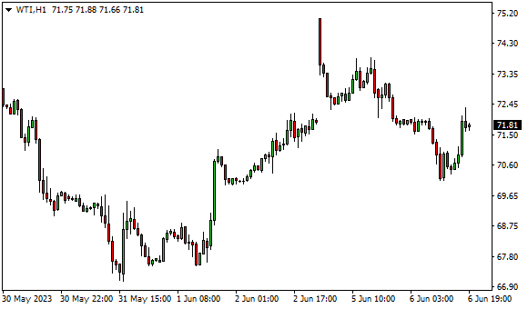Vývoj ceny ropy WTI (1hodinový graf - H1):