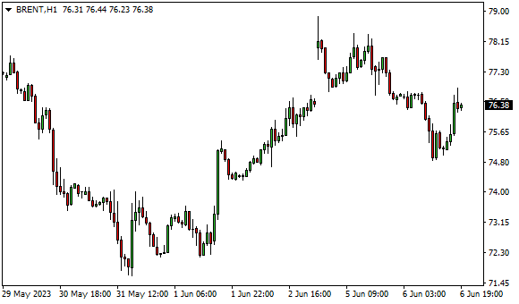 Vývoj ceny ropy Brent (1hodinový graf - H1):