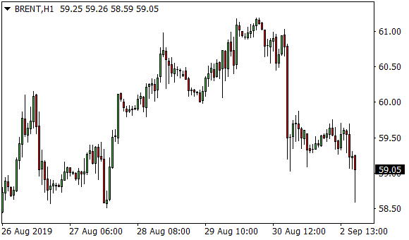 Vývoj ceny ropy Brent (1hodinový graf – H1):