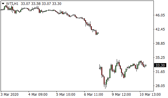 Ceny v pondělí spadly o více než 30 procent v reakci na postoj Saúdské Arábie výrazně zvýšit těžbu a citelně snížit ceny. Saúdové tím vyhlásili cenovou válku Rusku, které na schůzce OPEC a jejich spojenců minulý týden odmítlo přistoupit na návrh Rijádu snížit společně těžbu s cílem podpořit cenu suroviny. Saúdové chtějí v odvetě zaplavit trh ropou a maximalizovat svůj podíl na trhu.