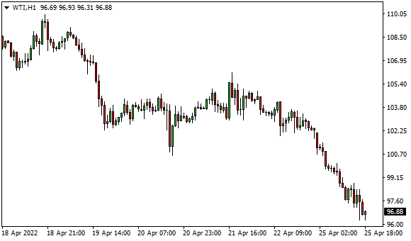 Vývoj ceny ropy WTI (1hodinový graf - H1):