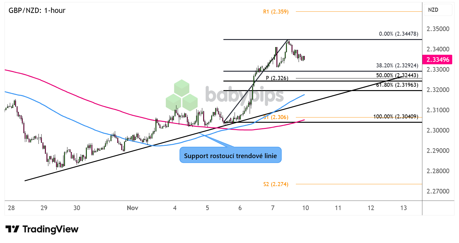Klíčová slova: GBP/NZD | Korekce | Měnový pár | NZD | GBP | Babypips | Graf | Vývoj měnového páru | TradingView | SMA | Vývoj | Pokračování rostoucího trendu | SMA 100 | Pokračování růstu | Trendové linie | Překřížení klouzavých průměrů |