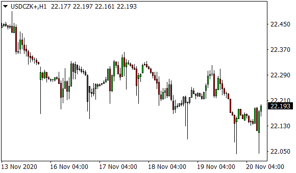 Vývoj měnového páru USD/CZK (1hodinový graf - H1):