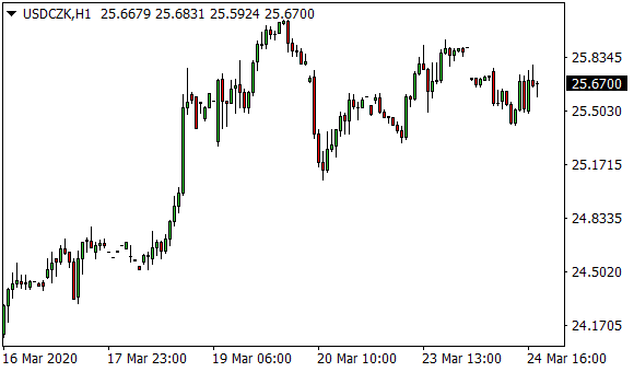 Vývoj měnového páru USD/CZK (1hodinový graf - H1):