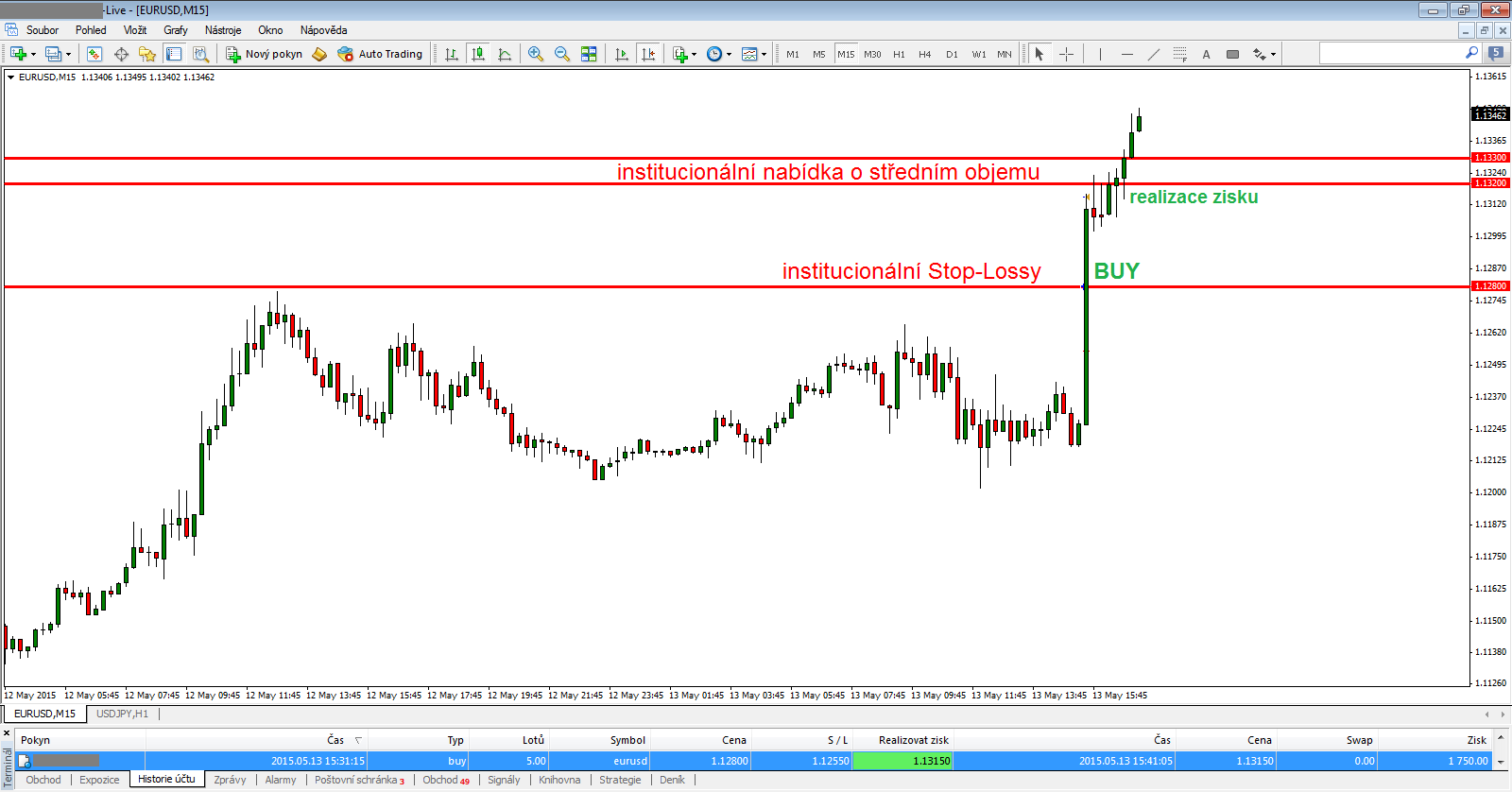 Dle dnešního denního expertního výhledu trhu pro měnový pár EUR/USD měli členové VIP zóny dostupnou informaci o akumulaci institucionálních Stop-Lossů na 1.1280. Vyplnění institucionálních Stop-Lossů ze short institucionálních obchodů znamená, že při jejich vyplnění se v trhu nashromáždí long obchodní příkazy a dojde k dalšímu silnému růstu ceny na trhu. Trader tak na základě této informace vstupoval při zasažení cenové úrovně 1.1280 do long obchodu.