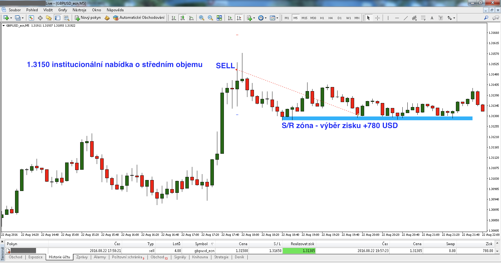 Jednoduše jsme tedy zadávali sell-limit čekající příkaz na cenovou úroveň 1.3150 se Stop-Lossem 15 pipů a Profit-Target jsme následně upravili dle nejaktuálnější S/R zóny, která se vytvořila po vstupu do obchodu.