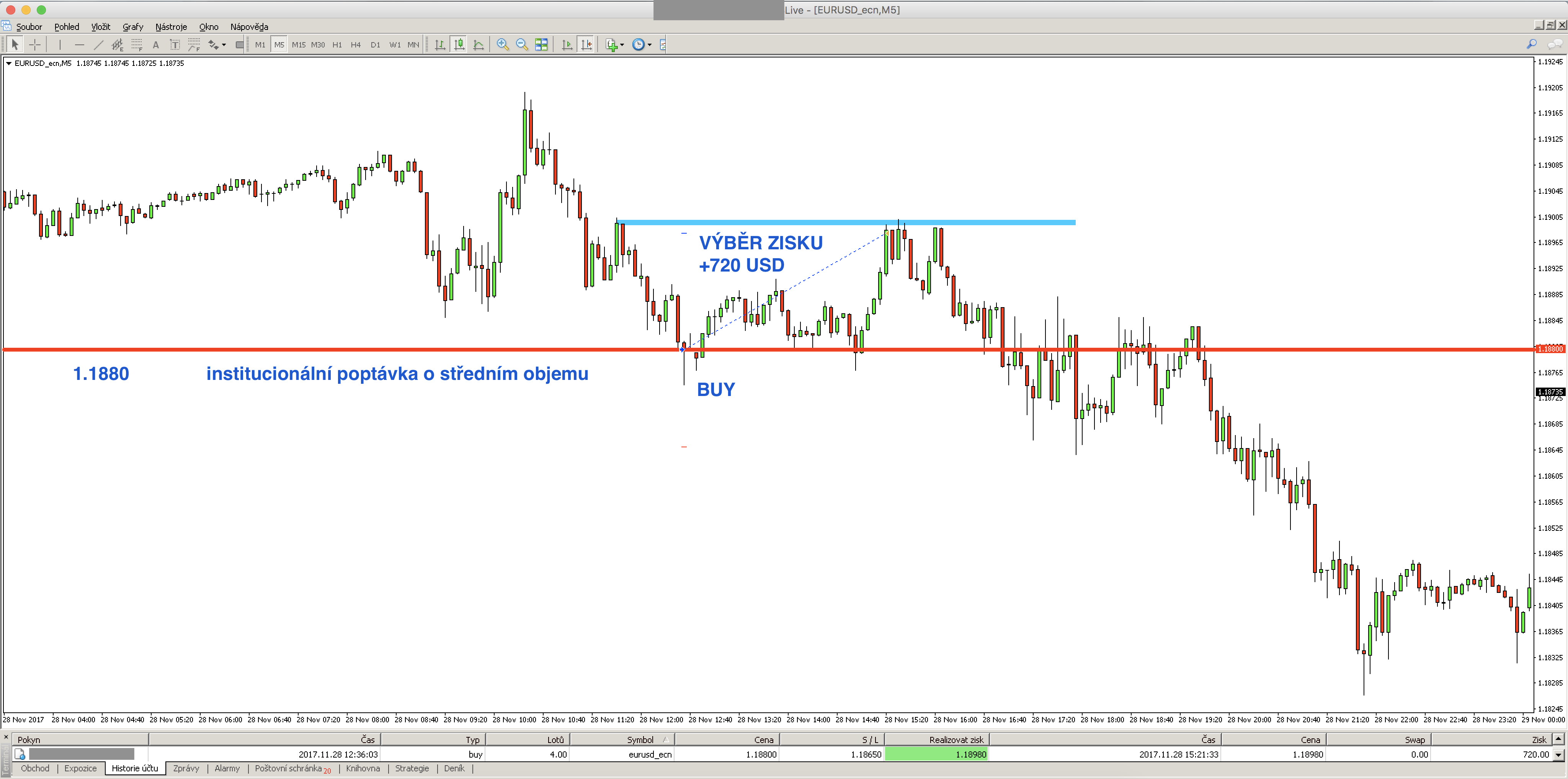 Zde jsme tedy realizovali obchod se ziskem 720 USD při objemu obchodu 4 loty.
