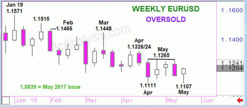 Signály minulý týždeň naďalej poukazovali na pokles a tento bol potvrdený počiatočnou stratou viac ako 1/2 veľkého čísla a novým 23 mesačným minimom vo štvrtok na úrovni 1.1107. Denný sentiment je však stále prepredaný a kupujúci sa vrátili na trh, aby pár zaznamenal rast o viac ako 1 veľké číslo zo štvrtkovej základne. Na páre bola vytvorená sviečková formácia denného kladiva (daily hammer) a pri sentimente poukazujúcom na dočasný rast, náš výhľad pre tento týždeň je býčí a predpokladá nákup pri otvorení trhu, ale s ponechaním priestoru na nákup poklesu ku 1.1150, otvorenie trhu vo štvrtok. Riziko predpokladáme v poklese pod 1.1107, minimum minulý týždeň. Cieľ predpokladáme v raste ku 1.1225, maximum 16. mája, 1.1265, maximum v máji a 1.1321, maximum v apríli.