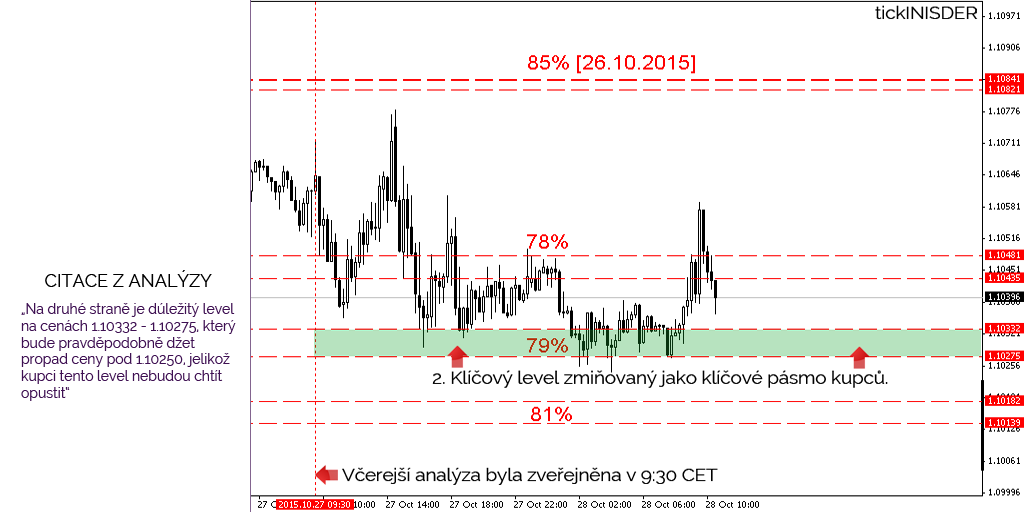 Z grafu níže je patrné, že cenový propad trhu se několikrát přesně zastavil v oblasti vyznačené short zóny. Proč? Odpověď zní jednoduše, pokud by se cena dostala výrazněji pod tento short level, pak by se zóna short ocitla nad cenou a tím dala signál chytrým účastníkům trhu, že na tomto levelu lze alokovat čekající příkazy typu sell-limit či počkat na obchodní příkaz za tržní cenu, což by způsobilo další pokles trhu, který by nezapadl do scénáře druhé strany trhu, v tomto případě kupců. Na grafu níže můžete vidět další z dostupné historie analýz (tickINSIDER pro den 27.10.2015 můžete najít zde), kde jsme právě short zónu udávali jako důležité pásmo, které kupci nebudou chtít opustit.