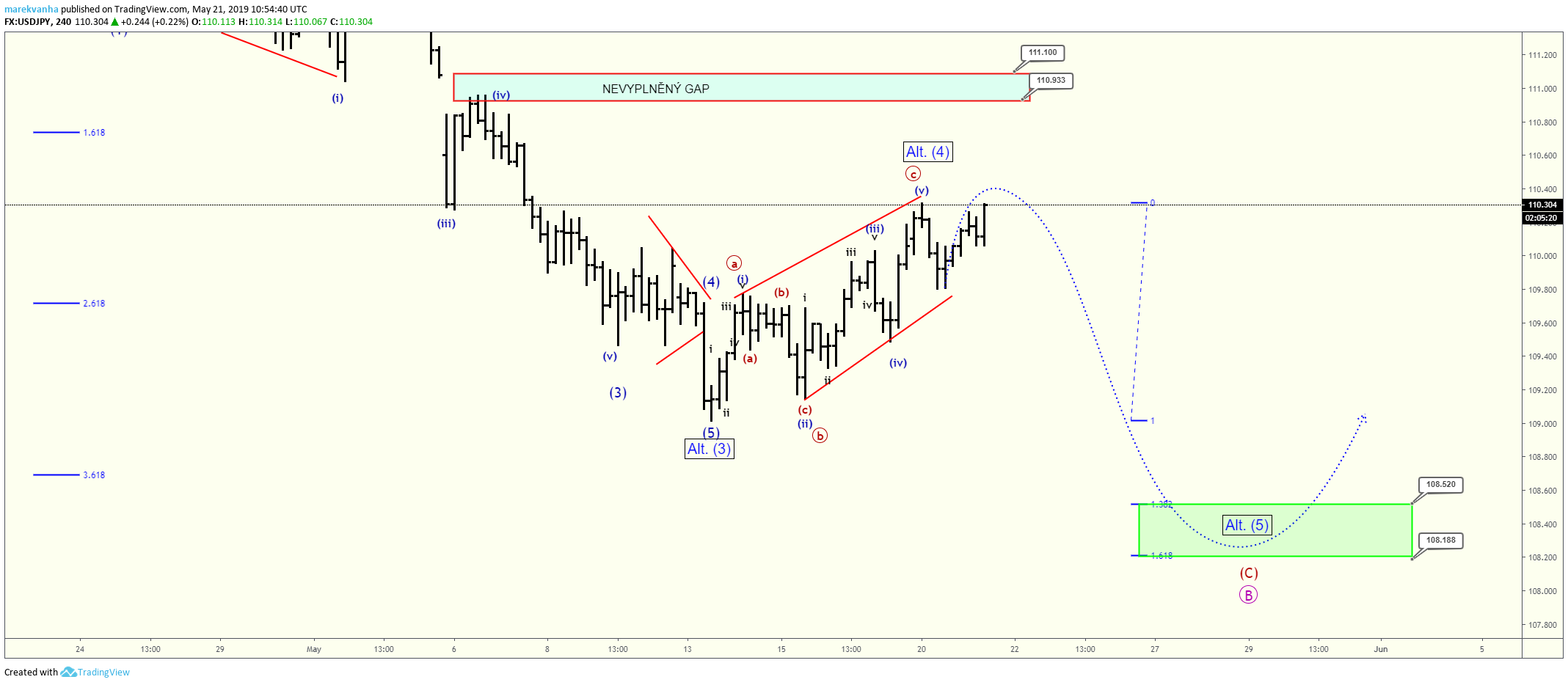 U USDJPY sledujeme potenciální Leading first diagonal = rising wedge. USDJPY měl dlouhý downtrend, který ale stále sledujeme pouze jako korekční před pokračováním up. Jako prioritní máme tedy tento bullish scénář, kdy nás čeká otestování nevyplněného GAPu = 110,933-111,1.
