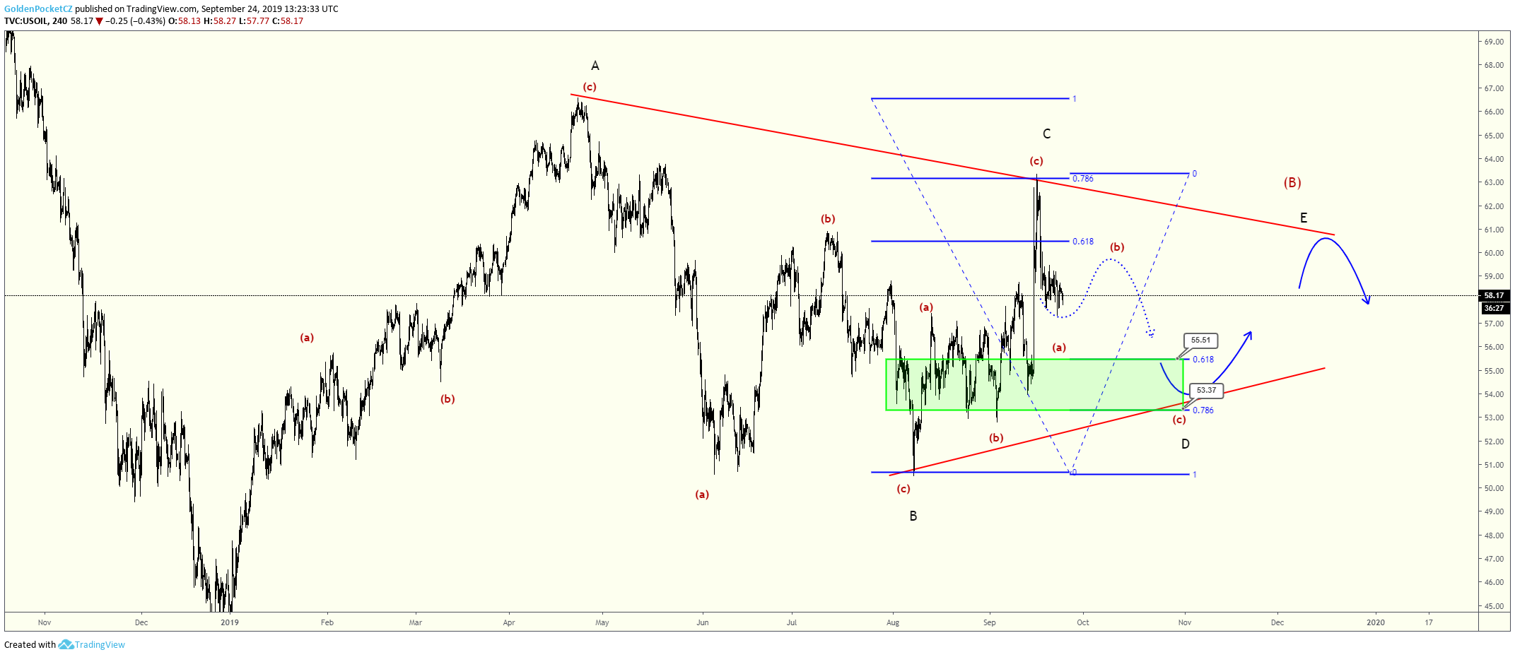 U ropy sleduji na vyšších Time frames sideways formaci velkého trianglu, kdy se nyní nacházíme s největší pravděpodobností v rozvíjení struktury vlny „D“. Každá vlna uvnitř trianglu musí mít podobu 3 vln, proto aktuálně uvažuji dokončování subvlny „(a)“, retracement vlny „(b)“ a poté pokračování subvlny „(c)“ k cca 55,5-53,37,-USD. Hlavní trend, který uvažujeme u ropy je downtrend, proto tento triangl anotujeme jako bearish a součást vlny „(B)“ celého downtrendu.