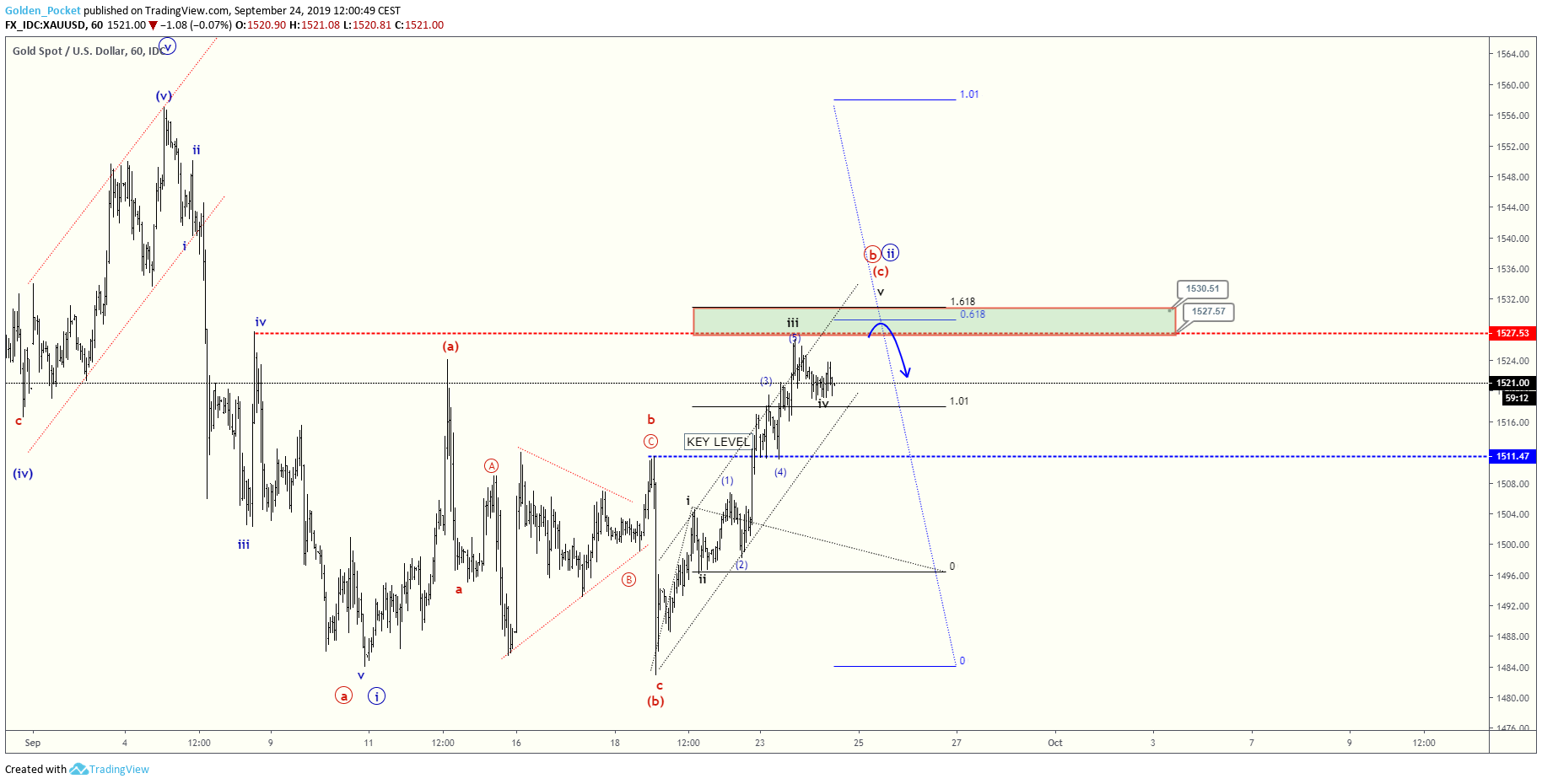 U zlata stále očekávám pohyb up do zóny 1527 – 1530 kde se nachází 0,618 fibo retracement + 1,618 fibo extension vlny „i“ a resistence ve formě vrcholu vlny „iv“. Vrchol vlny „iv“, bývá ten nejlepší target pro dokončení korekční struktury, takže zatím u zlata sledujeme stále stejný scénář. Zde se tedy s největší pravděpodobností dokončí vlna „((b/ii))“, odkud bychom měli v aktuálním downtrendu pokračovat.