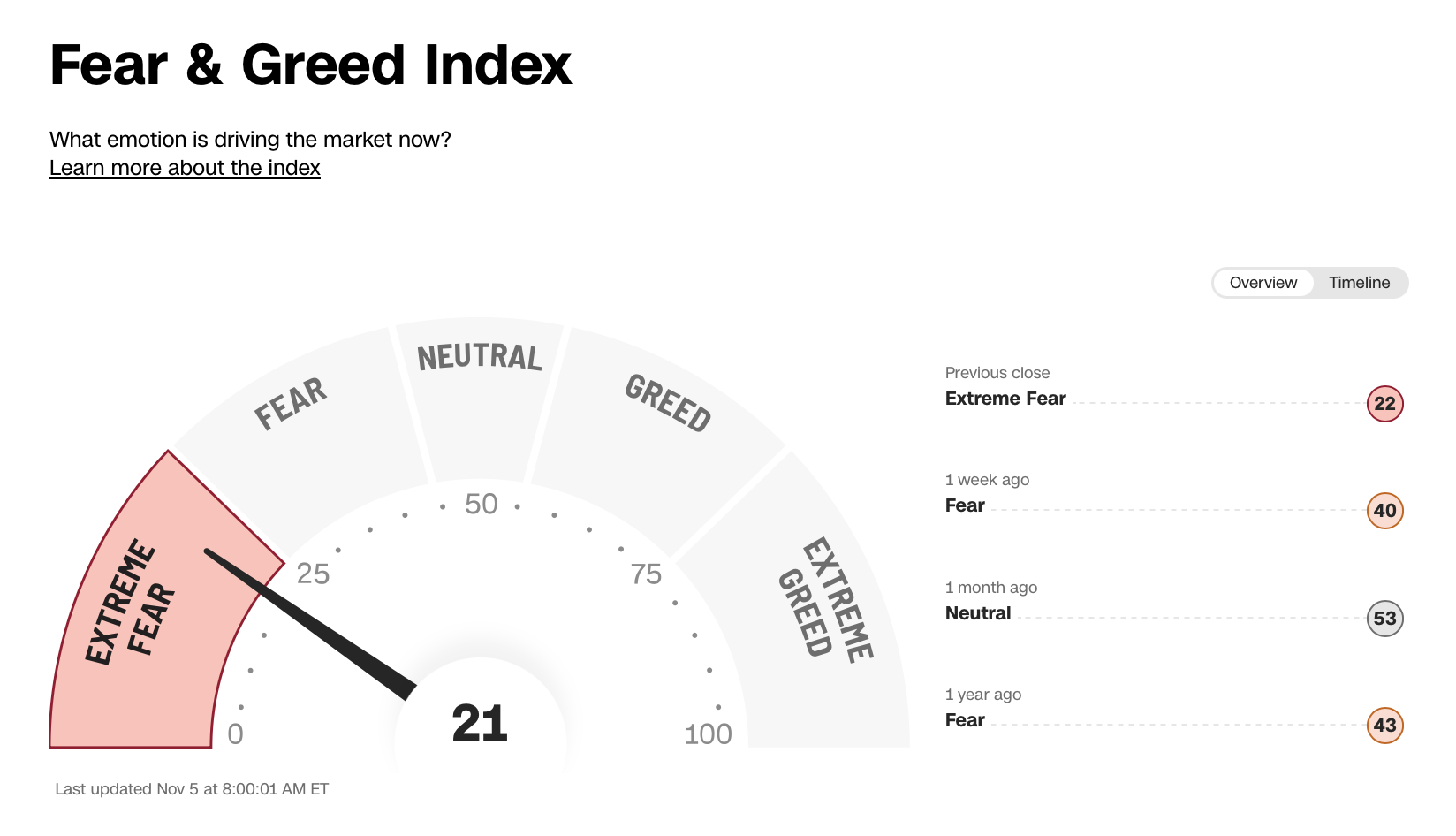 Pod povrchem ale panuje nervozita, CNN Fear & Greed Index, který měří náladu investorů, se v druhé polovině října přesunul do pásma strachu a aktuálně je na hodnotě 21, která značí dokonce extrémní strach.