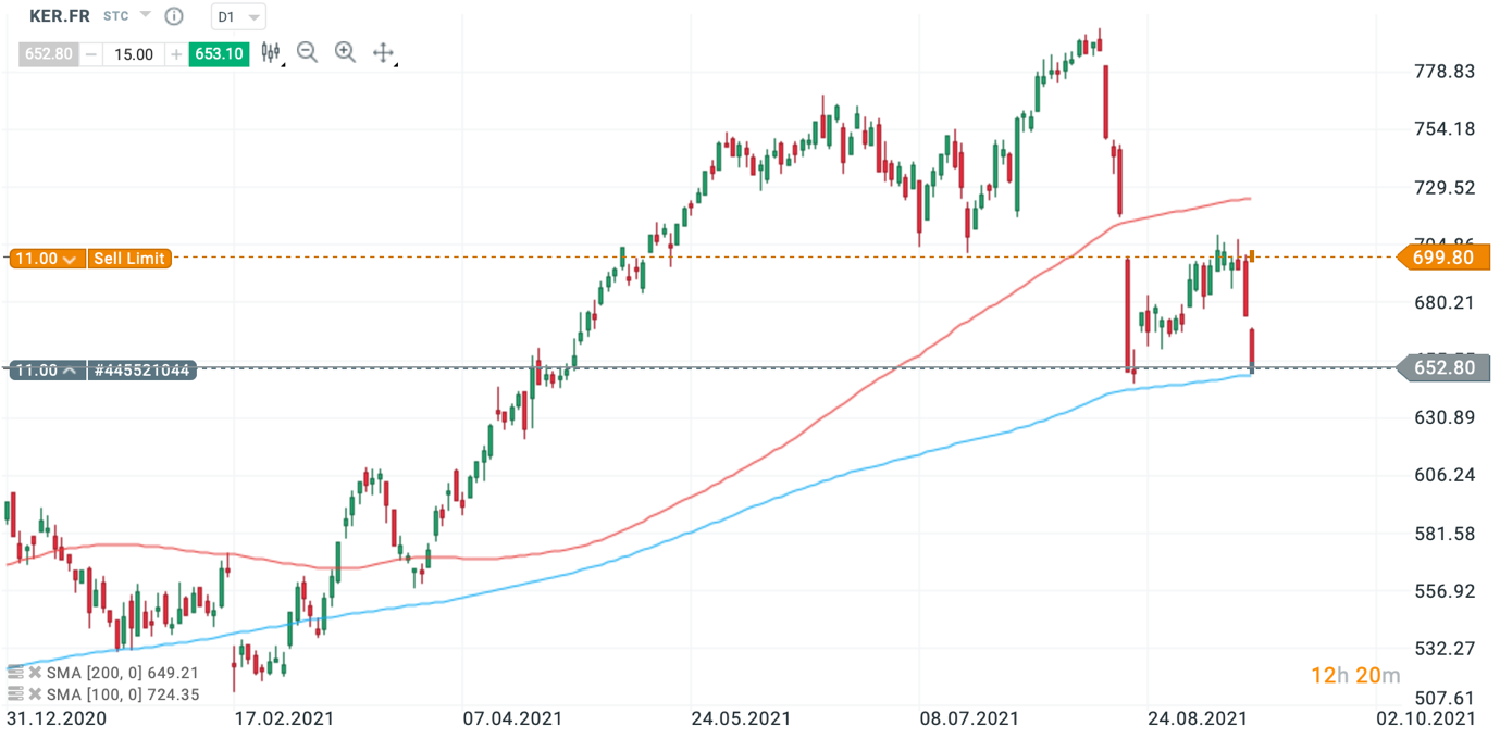 Dneska (15.9.) Kering stále směřuje dolů, další zóna pro dokup se nabízí na ceně 580 EUR, kdy se cena na týdenním grafu dotkne 100 SMA.