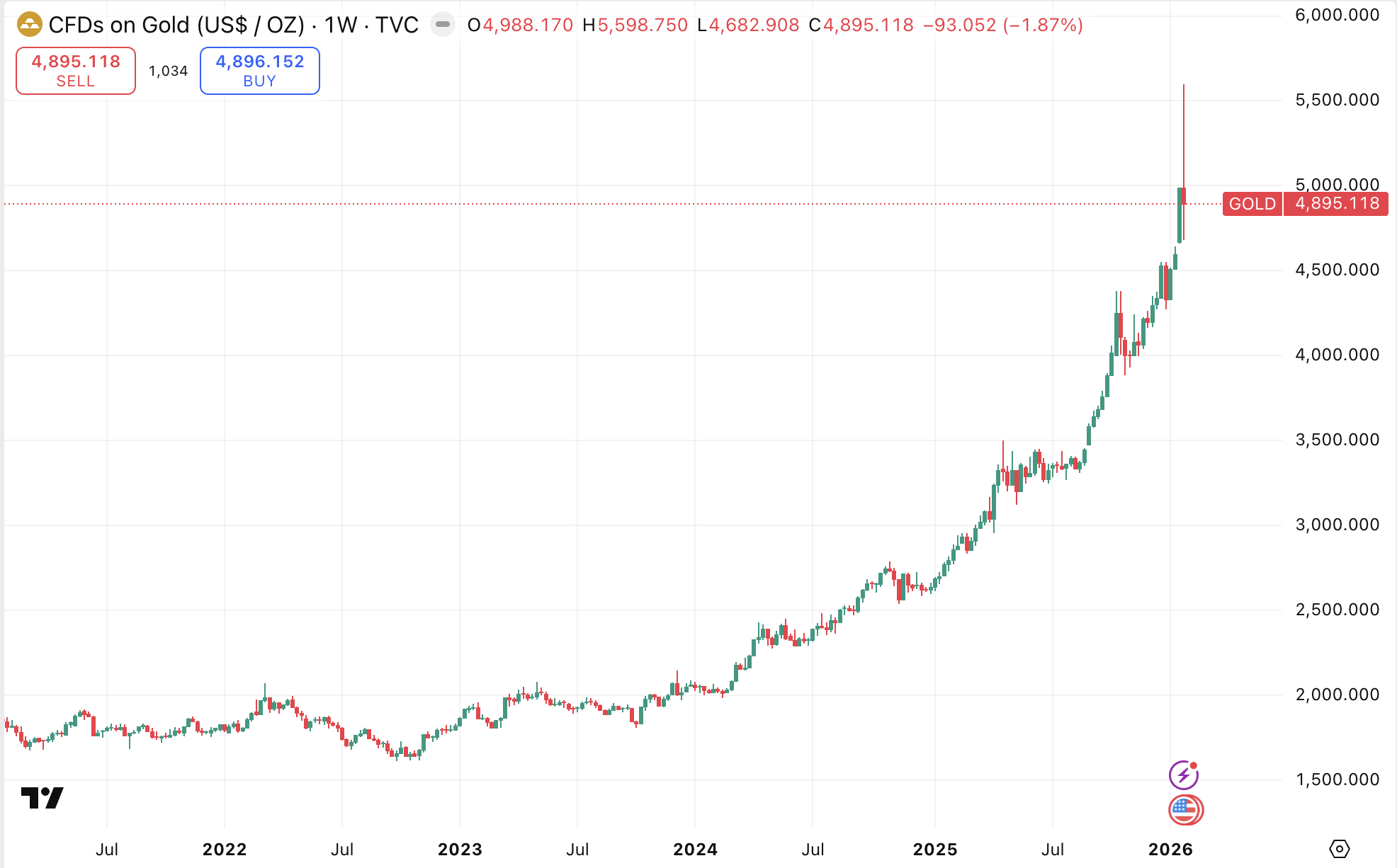 Geopolitická nejistota, které je Donald Trump příčinou, poslala v lednu ceny zlata na absolutní rekord – téměř 5 600 amerických dolarů za trojskou unci, než se cena zlata poslední dva lednové dny propadla na hodnoty kolem 4 900 dolarů. I tak zlato za poslední rok vyrostlo o 75 %, protože zlato v nejistém prostředí pro investory tradičně představuje bezpečný přístav.