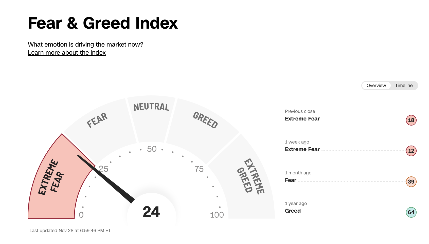 Po celý listopad tak panovala na trzích značná nervozita, CNN Fear and Greed Index, který měří náladu investorů, dokonce jednu chvíli vykazoval hodnotu 6, což značí extrémní strach na trzích.