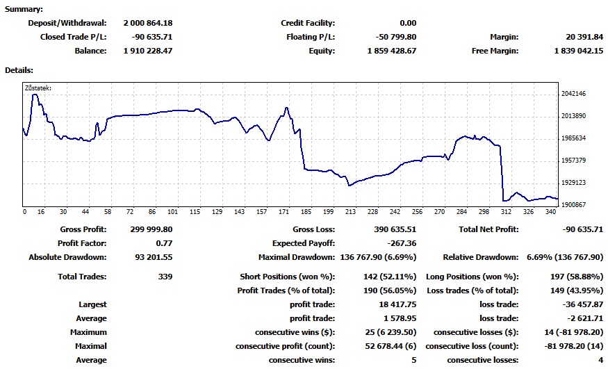 Přestože výše popsaný obchod skončil ztrátou, neměl žádný zásadní vliv na vývoj balance křivky. Obchoduji s nižším objemem a vyčkávám na sérii ziskových obchodů, které mi umožní vytvořit si potřebný polštář pro postupné navýšení objemu. Balance křivka se zatím drží na svých minimech a vykazuje spíše pohyb do strany.