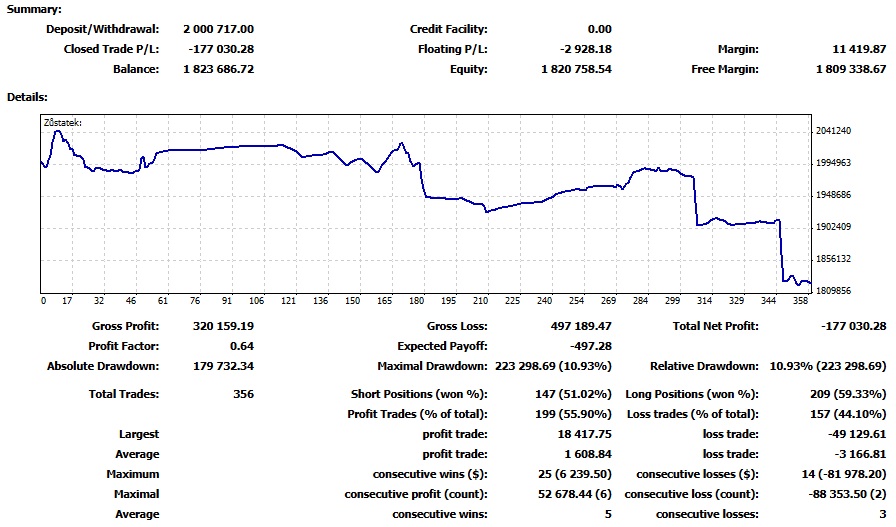 Na balance křivce se toho od minulého týdne příliš moc nezměnilo. Aktuálně mám ještě otevřený obchod na akciovém indexu S&P 500 a vyhlížím příležitosti na forexu. Strategie je v tomto případě jasná. Vygenerovat sérii ziskových obchodů tak, aby bylo možné navýšit objem obchodů. Bez toho se balance křivka do růstu nedostane. Na balance křivce je krásně vidět, co bylo největším problémem challenge - vysoká lotáž. Snaha splnit challenge co nejrychleji se tak nakonec vymstila. Na začátku totiž vznikla ztráta, kterou je při nižším objemu obchodů velmi složité dohnat.
