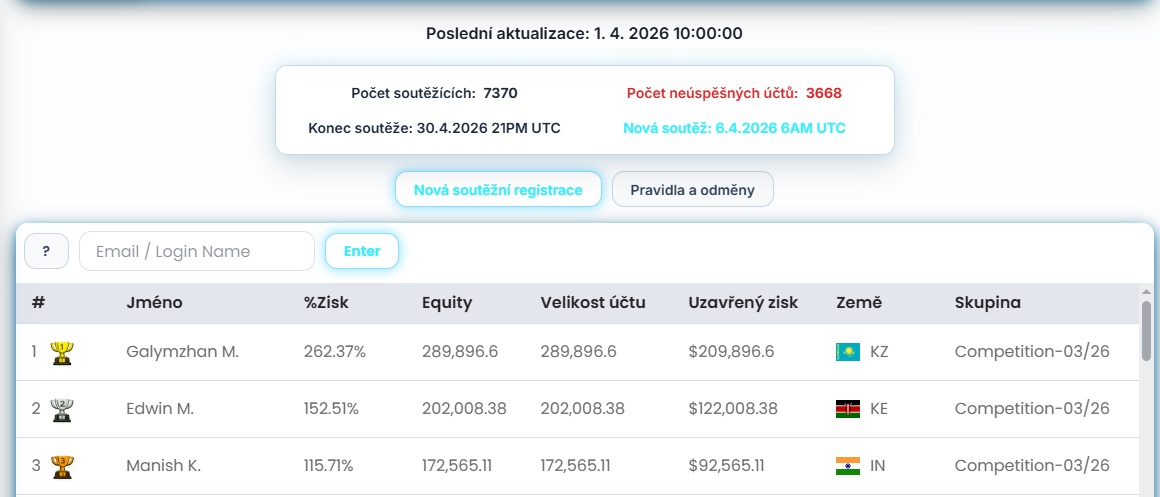 Vítám vás u článku, který budeme věnovat prop tradingu a plnění challenge. Již příští týden 6.dubna vypukne další kolo tradingové soutěže o prop challenge zdarma, které se zúčastním. V tomto článku se podíváme na to, jakých výsledků je pro úspěch v soutěži potřeba dosáhnout a jak se dařilo v minulém měsíci těm nejúspěšnějším. Získat challenge díky soutěži je totiž skvělá možnost, jak získat fundovaný účet bez toho, aby bylo nutné samotnou challenge kupovat.