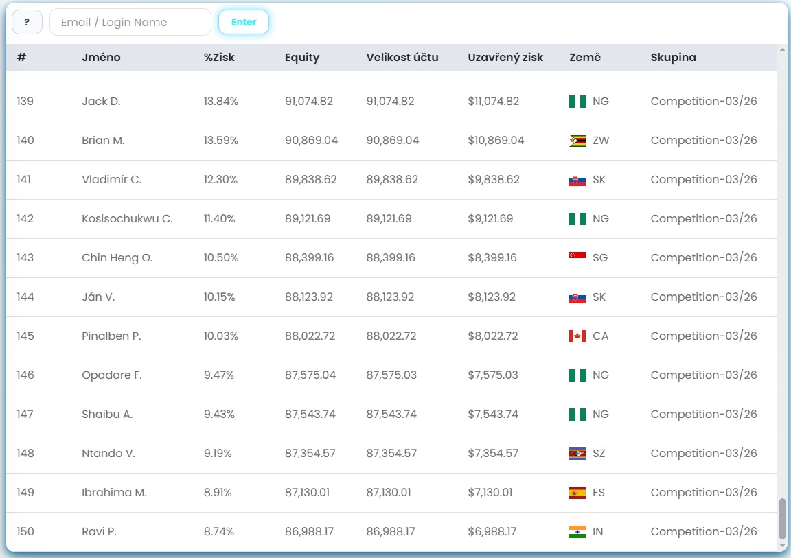 Poslední soutěže se zúčastnilo celkem 7 370 obchodníků, což je již poměrně slušné číslo a zároveň i velká konkurence, protože všichni účastníci mají stejný cíl - uspět v soutěži a získat challenge zdarma. Když se podíváme na měsíční výkonnost tří nejlepších obchodníků, tak ta se pohybuje nad 115 %. Jen pro představu, málokterý obchodník, který se účastní World Trading Cupu s reálnými penězi, tuto výkonnost dokáže generovat za rok!