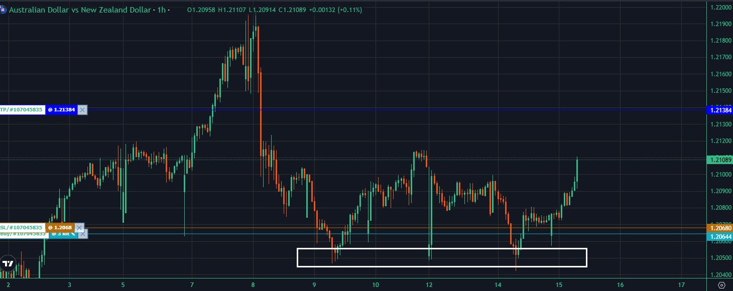 Tento long obchod jsem otevřel nejen na základě toho, že se měnový pár dlouhodobě obchoduje v rostoucím trendu, ale především kvůli supportu, na který trh klesl. Tento měnový pár měl evidentně problém prorazit na nižší úrovně a došlo zde ke třem testům supportu. Poté, co trh vytvořil nákupní aktivitu, jsem po třetím testu otevřel long pozici.