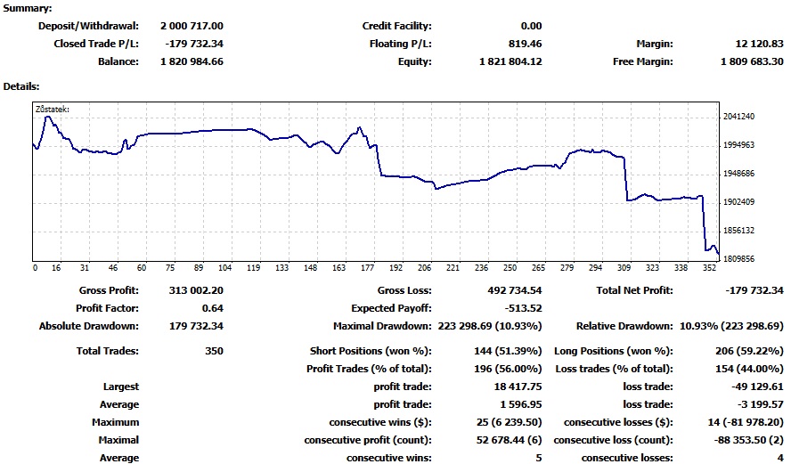 Přestože jsem výše popsaný obchod uzavíral na hodnotě kousek od break even, tak to mělo malý vliv na hodnotu balance křivky. Nevýhoda tohoto obchodu spočívala v tom, že se časově protáhl. Kapitálový výnos byl jen mírně záporný a většinu ztráty tvořil swap z držení pozice. Balance křivka se tedy lehce propadla a vytvořila nové minimum.
