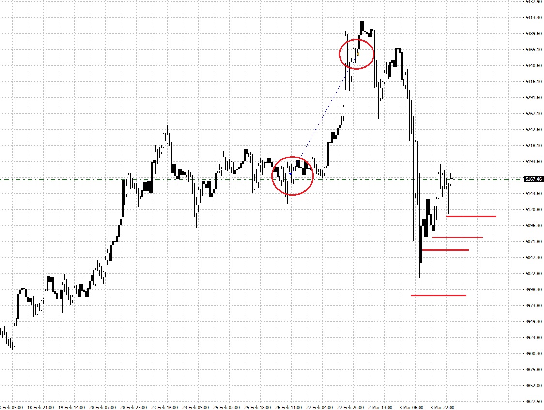 Sice byl tento obchod významně ovlivněn volatilním cenovým pohybem kvůli válečnému konfliktu, ale celá jeho příprava spočívala ve čtení cenového grafu. Zlato totiž minulý týden rostlo a tvořilo vyšší minimální hodnoty, což je trendový pattern, který sleduji. Následně se cena zlata uchýlila do postranního trendu. Samotná konsolidace trhu na swingovém maximu hovoří o přetrvávající síle kupců, což byl další důvod uvažovat o long obchodu.