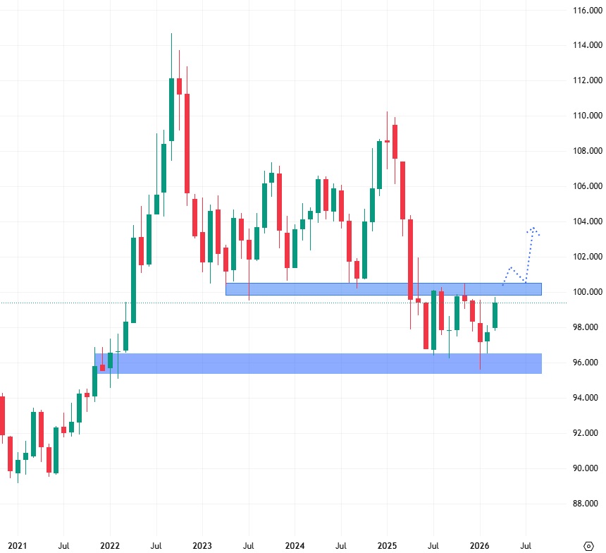 Americký dolar se od svého oslabení v roce 2025 pohybuje směrem do strany s tím, že aktuálně znovu testuje hodnotu horní hrany této konsolidace. Pro vznik dlouhodobějšího a výraznějšího trendu je ovšem třeba, aby USDX opustil pásmo současného postranního trendu. K tomu by došlo, pokud by prorazil 100 bodů, čímž by se vrátil do svého dlouhodobějšího pásma ještě z dob vlády Joe Bidena.