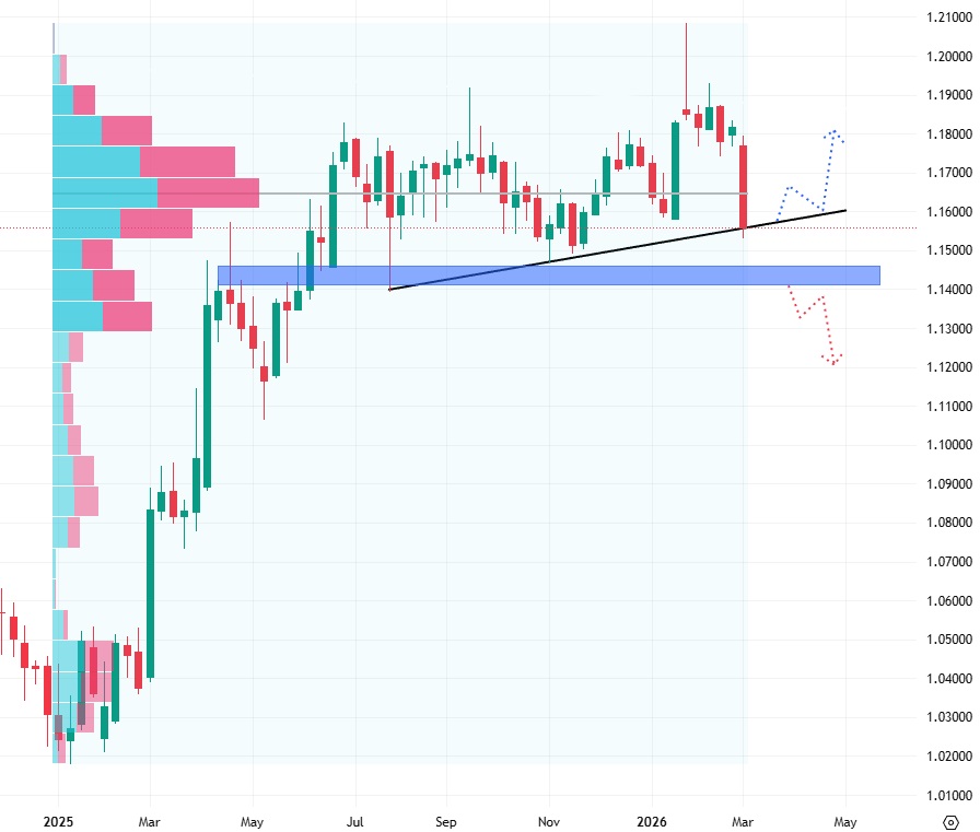 Vítám vás u dalšího Praktického okénka, které budeme tentokrát věnovat širšímu kontextu finančních trhů. Nejprve se podíváme na index amerického dolaru, který se dlouhodobě pohybuje v postranním trendu, nicméně konflikt na Blízkém východě jej dokázal opět vystřelit na horní hranu této konsolidace. Následně navážeme pohledem na cenový graf hlavního měnového páru EUR/USD, kde je dost patrné zamítnutí vyšších cenových úrovní, což může predikovat klesající trend.